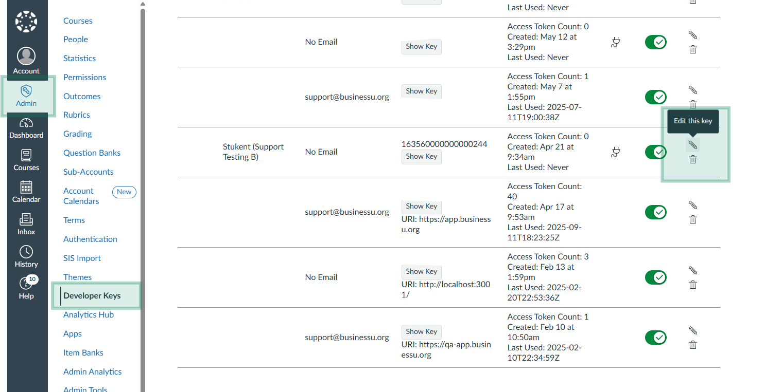 2. Go to the Admin tab and navigate to the Developer Keys section (at the root level).