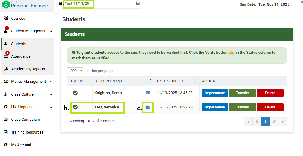 Alternatively, you can select to disable the accounts of your students in your course, rather than remove them. This will prevent them from accessing the simulation. This will be within the Personal Finance Simulation under Student Management>Students>Selecting the Status next ot the student's name.