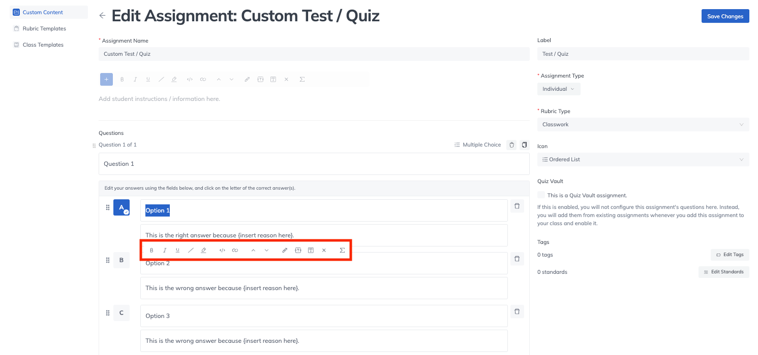 - To style questions and answers, simply highlight any text in a question or answer field to activate the styling toolbar.