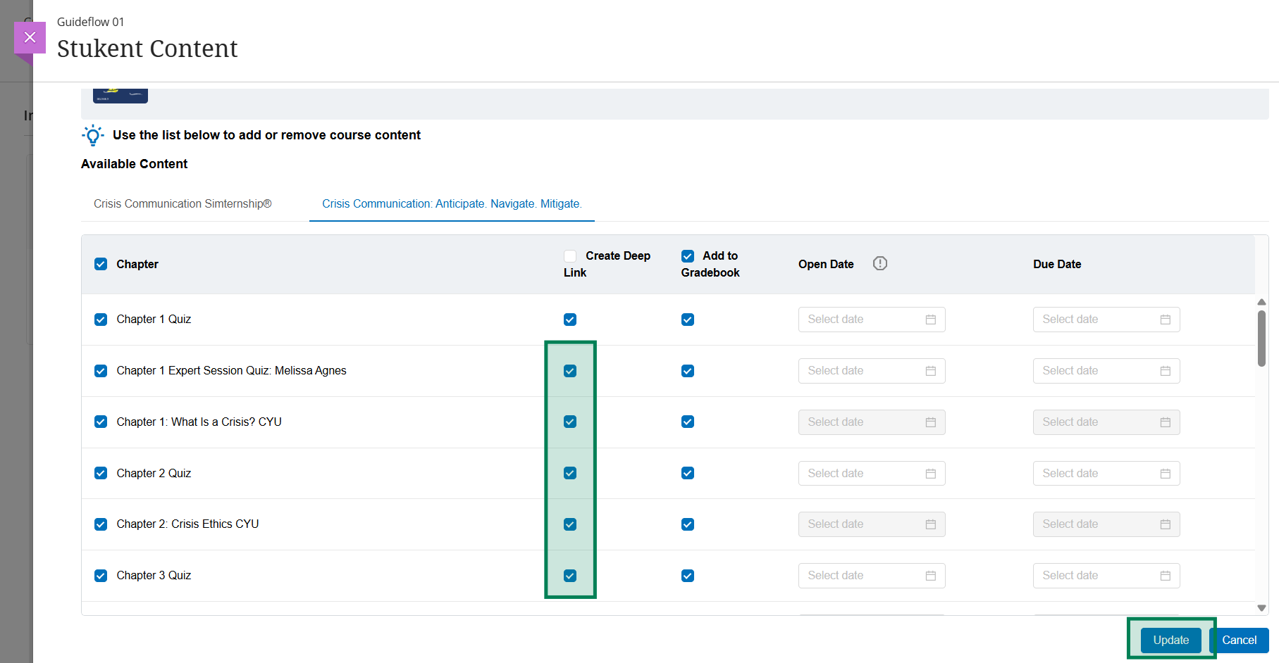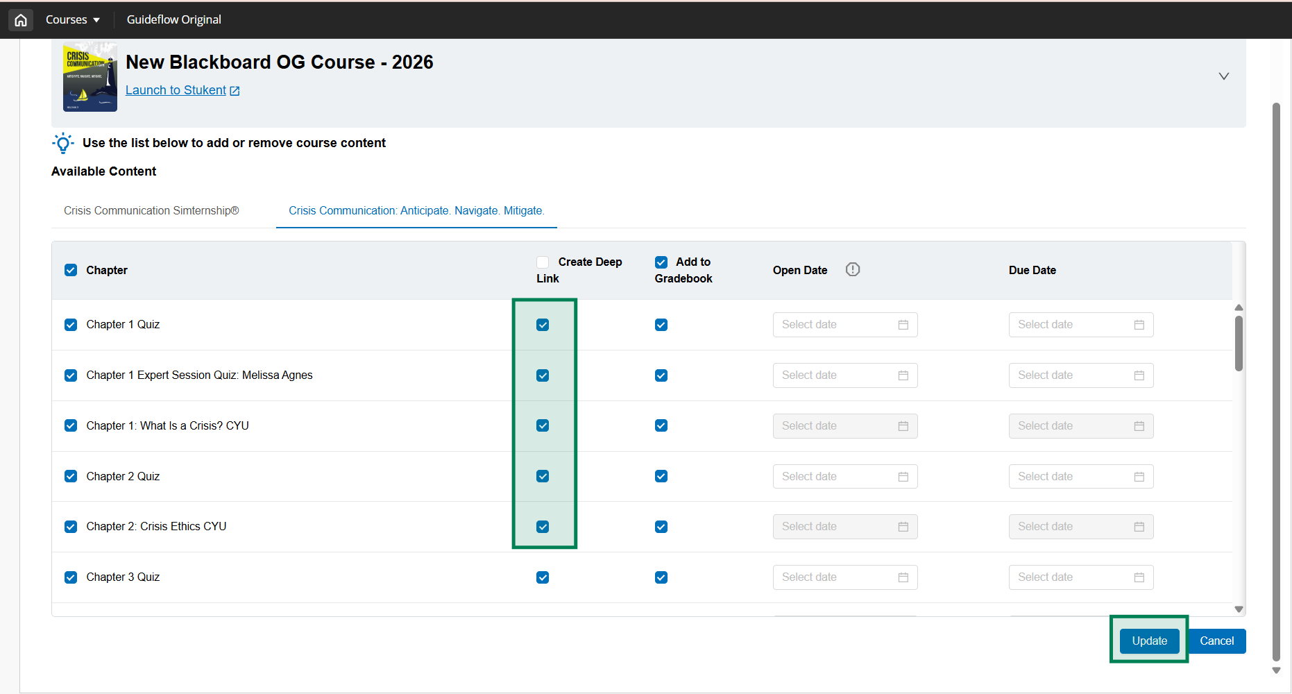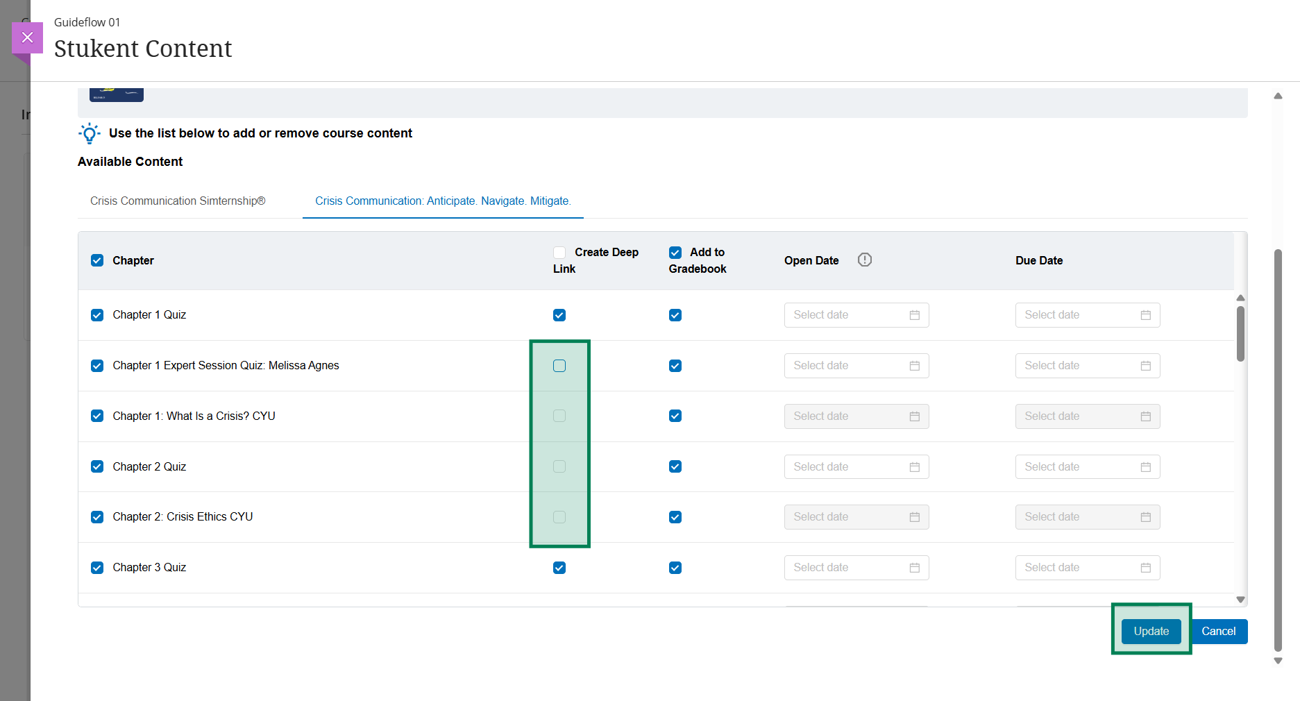 - Once the page refreshes on it's own, reselect the Deep link checkbox(es) for the assignment(s) needing new deep links, scroll down and select "Update".