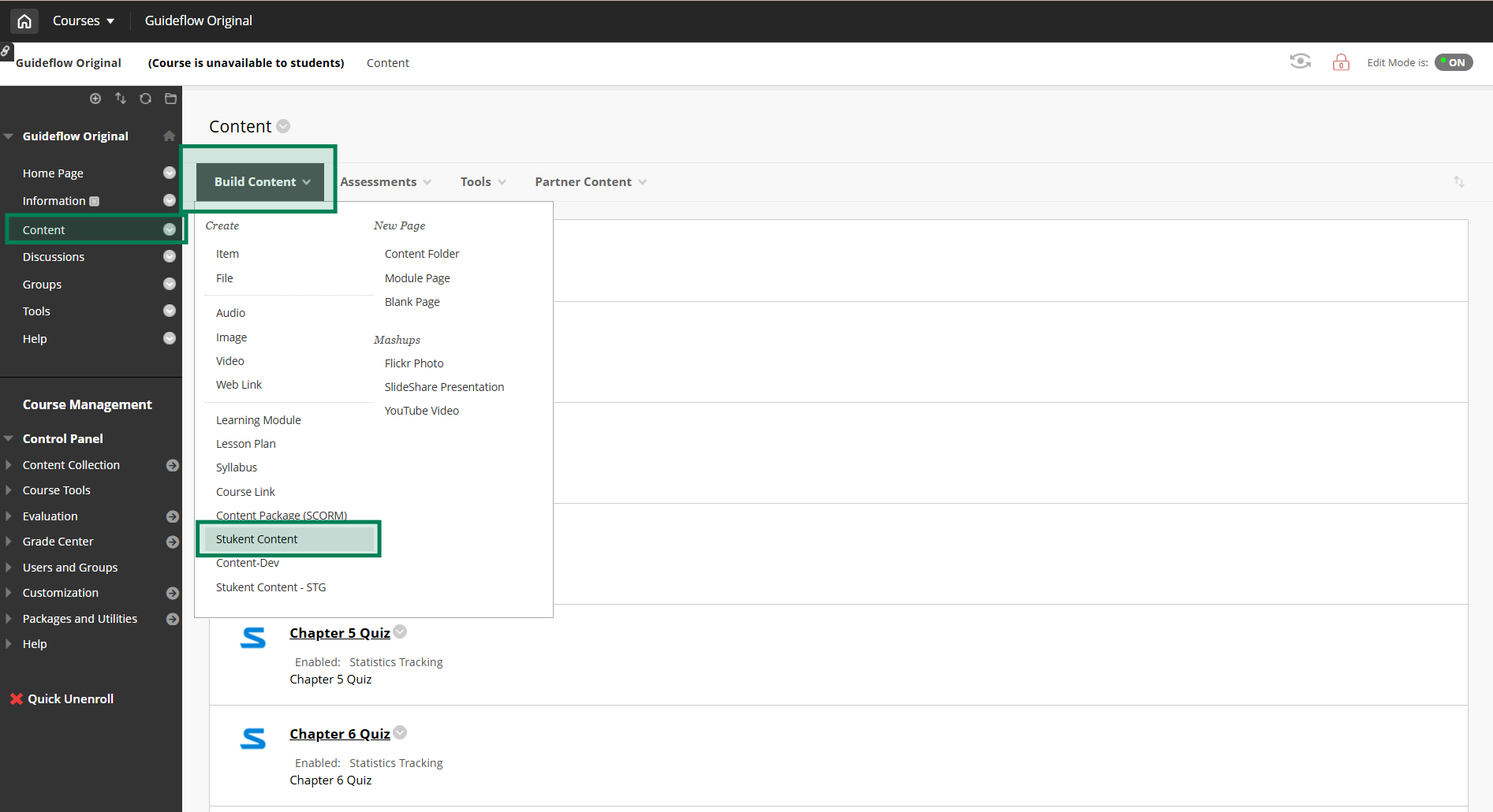 Within the Content tab, click the dropdown "Build Content" and then select "Stukent Content".