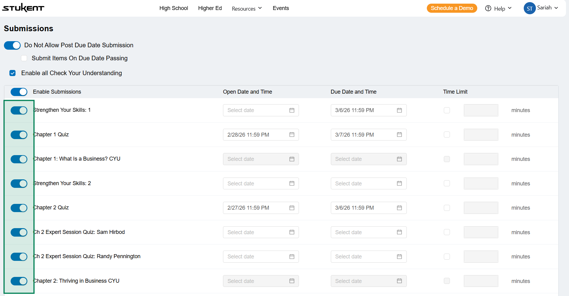 The checkbox to the left of the assignment title is to control if it is enabled/disabled for students on the Stukent side (shown below).