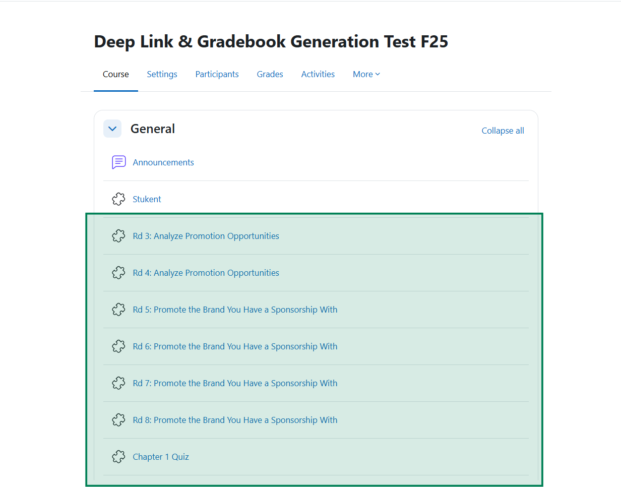 Here is an example of what the deep links and gradebook items will look like in Moodle.